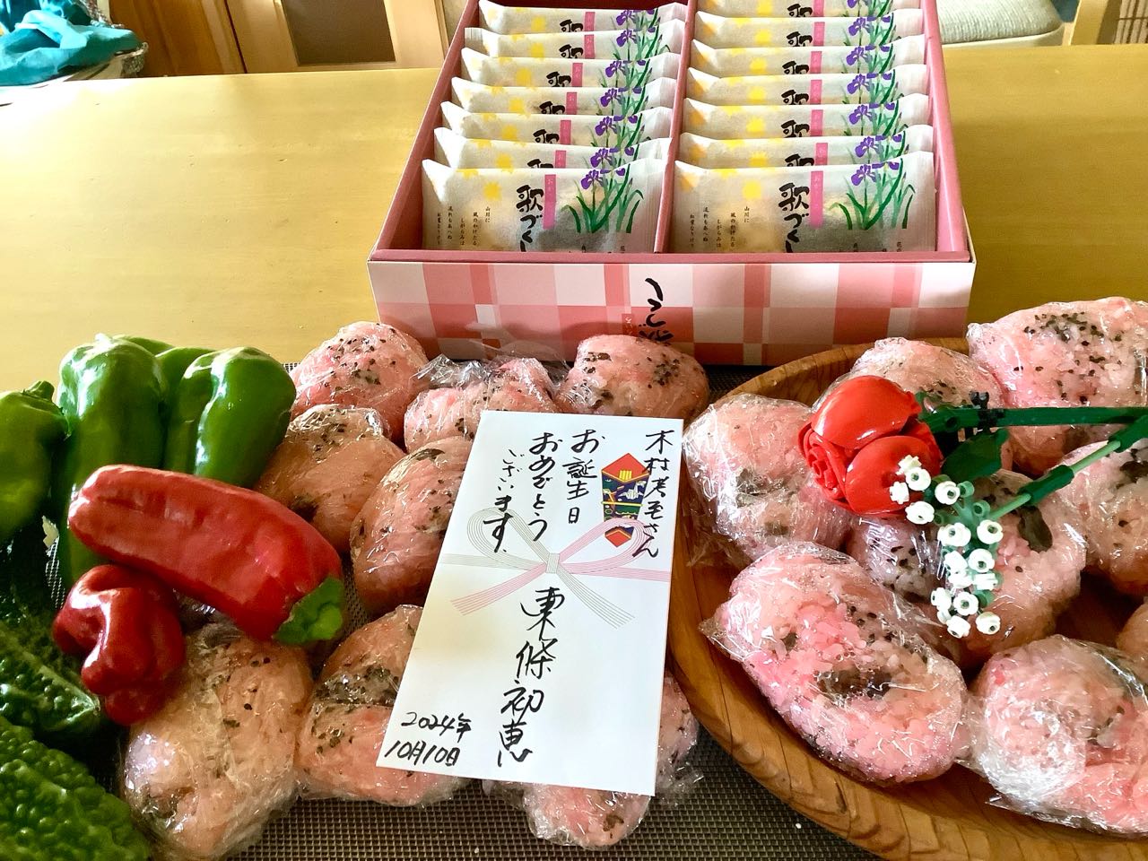 10月10日は、→千葉県木更津市に、嫁いだ、長女の、ご主人→木村考至(たかのり)さんの.お誕生日です..朝早く起きて、お赤飯を炊いて、「おにぎり」にして、、お家で、取れた.茄子や.ピーマン、ゴーヤ等の、野菜をいっぱい入れて、お誕生日のお祝いの袋の裏に、娘や孫たちを、よく見ていただく。お礼のメッセージをいっぱい書いて、美味しい「おせんべい」も、入れて、今朝8時20分までに、クロネコヤマトに、持ち込みました、今日、夕方6時過ぎに到着予定だそうですので、ほっと、しています、ご覧になってください、