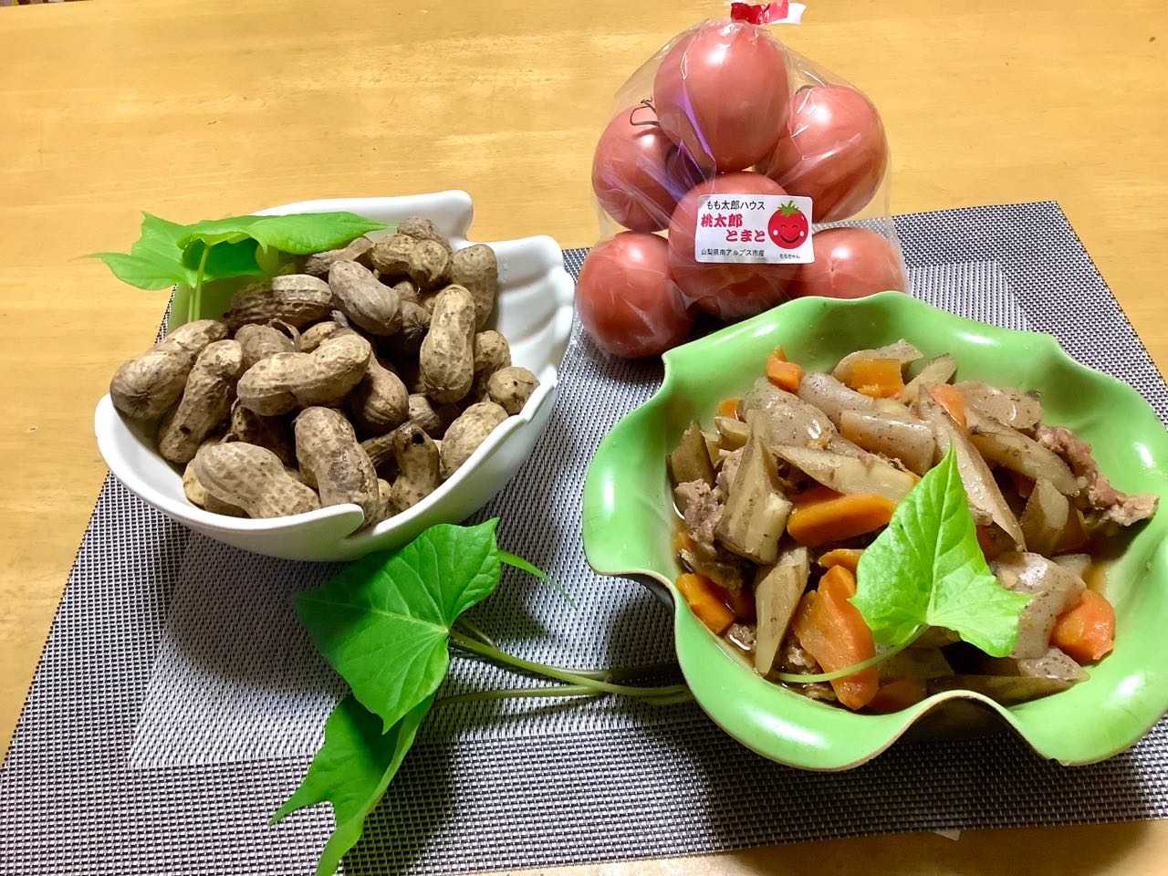 13日.夕方.一邦さんが→畑から大きなピーナッツを、掘ってきましたので.早々に「塩ゆで」に.しました。大きいピーナッツですので、茹で時間が.20分ほどが、かかりましたが、とっても美味しく出来上がりました、今年の→新ごぼうを、人参と、コンニャクと、豚肉を入れて、圧力鍋で、15分ほどで→とっても美味しい、煮物ができ.上がりました.ピーナッツが入っている。白い、手の形をした→お皿は、フランスに行った時、オルセイ美術館から買ってきました、グリーンのお皿は、、ベトナムに行った時、焼き物の製造元で、購入して来た、お皿です、トマトは南アルプスさんです、