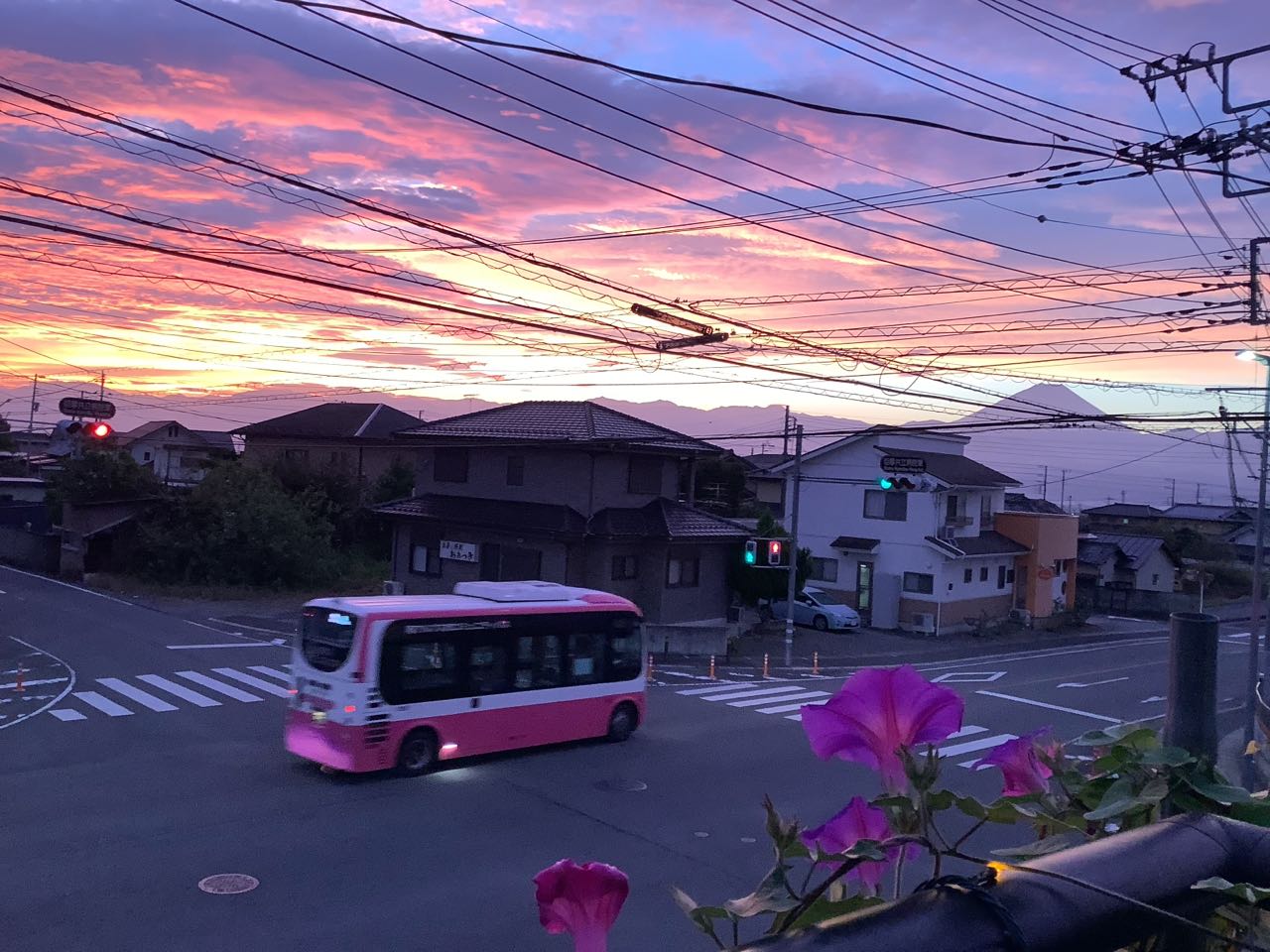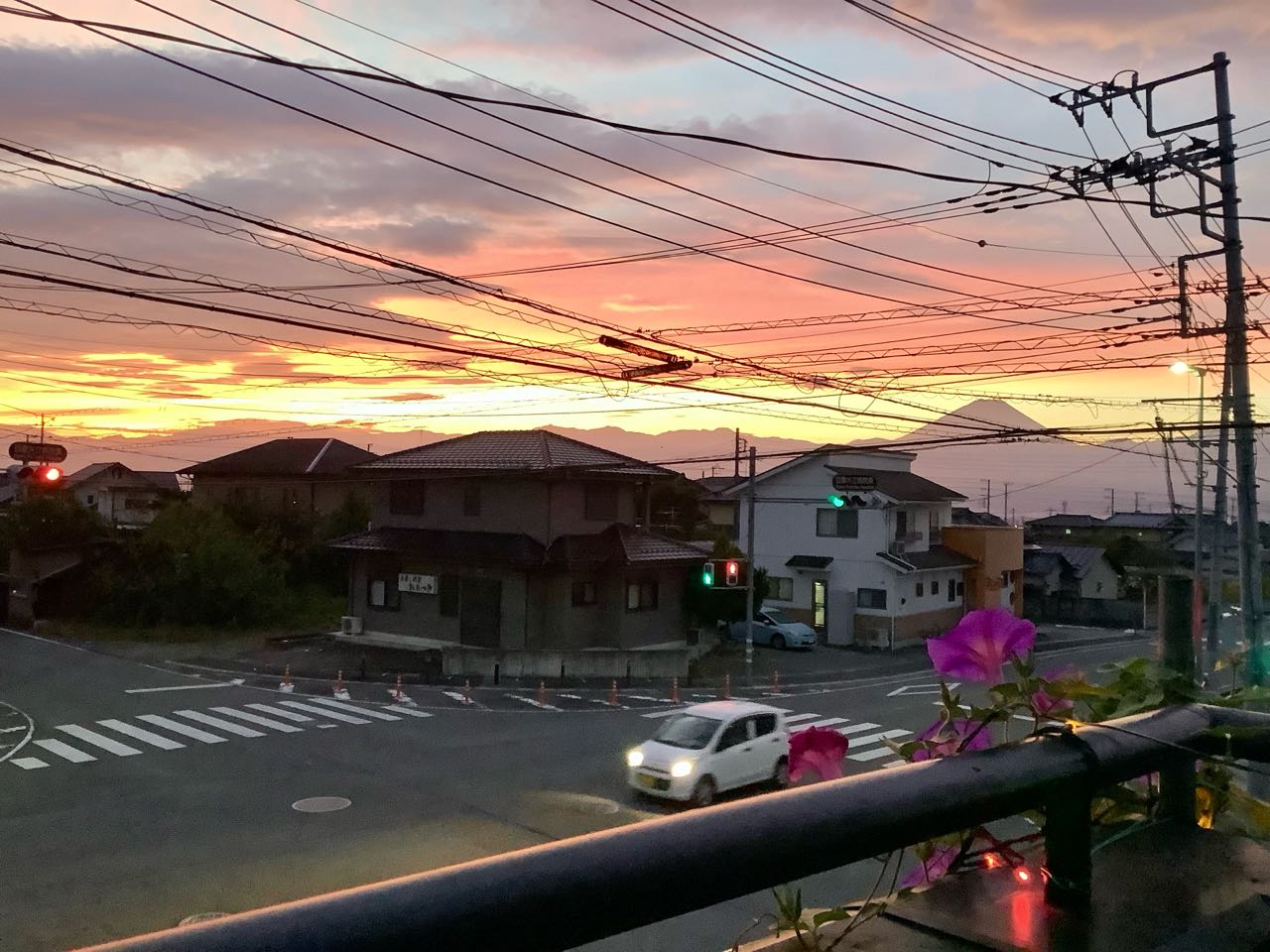 私はまだ眠っていましたら、一邦さんは、毎朝5時ごろ起きますので、、私に知らせに来てくれました。、私は飛び起きて→東の空を見たら、真っ赤な朝焼けでした。もう車も、走っていました、、遠くに富士山も見えます。、2階のベランダの、「朝顔の花」も、一緒に.ご覧になって下さい、。