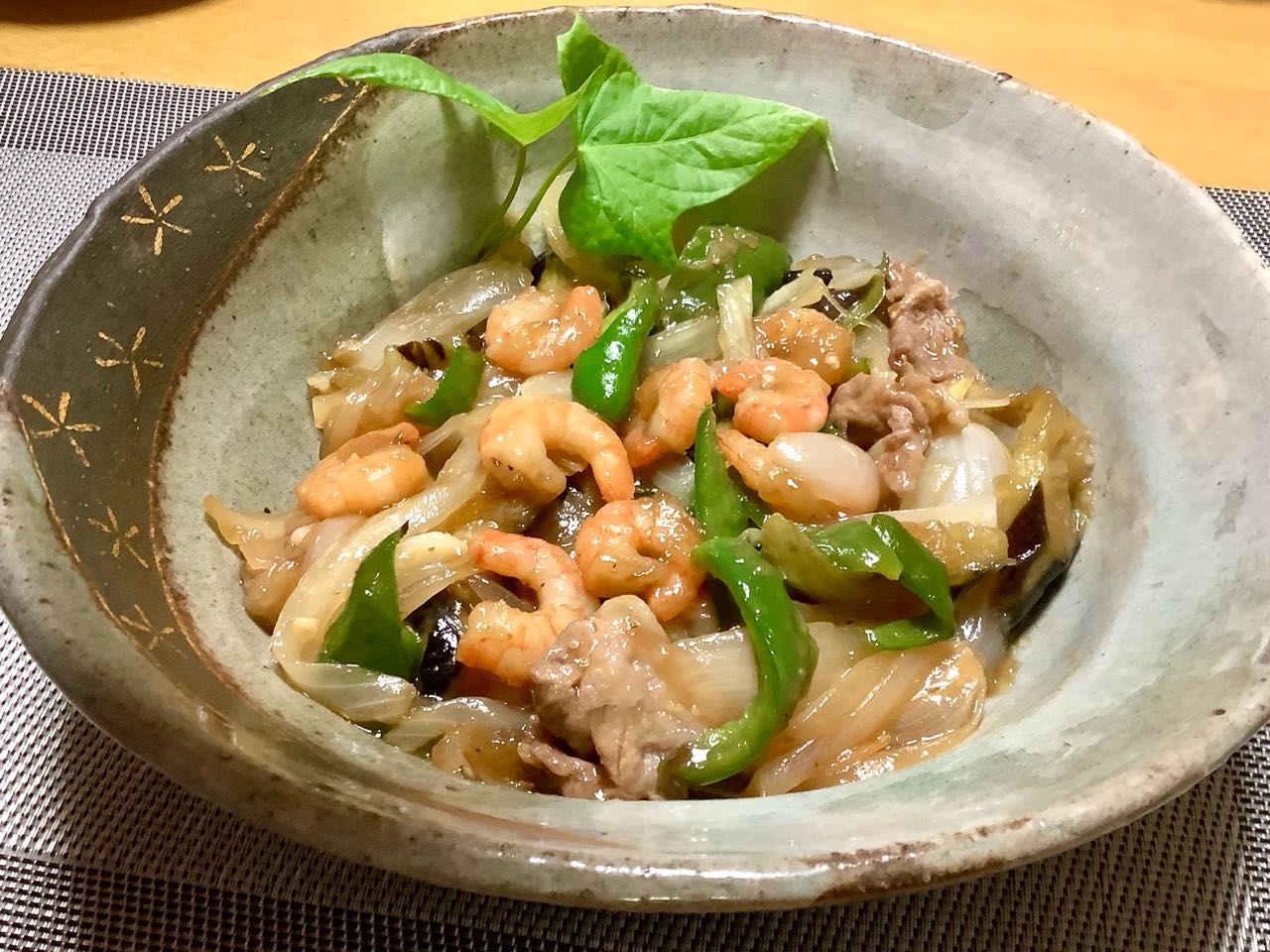 昨日、夕方♪.→パル、システムから、取り寄せた→エビと.豚肉と.茄子と.ピーマンと.玉ねぎを一緒に炒めて.甘酢あんかけで.お料理しました。とっても.美味しかったです。一邦さんが、食後に♪甘柿を彫刻刀で、切った様に、綺麗に剥いてくれました、ご覧になってください。.