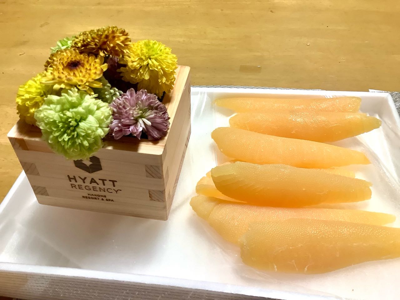 14日...お正月の→「数の子」を、これから→塩抜きをして、和えて.いただこうと、思っています、マスに→生けてある花は→お正月♪次女Akikoさん家族が.箱根ハイアットホテルに泊まった時の、マスの花が、まだ♪元気です♪