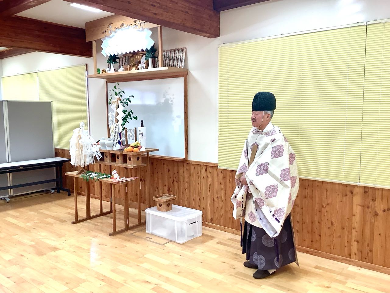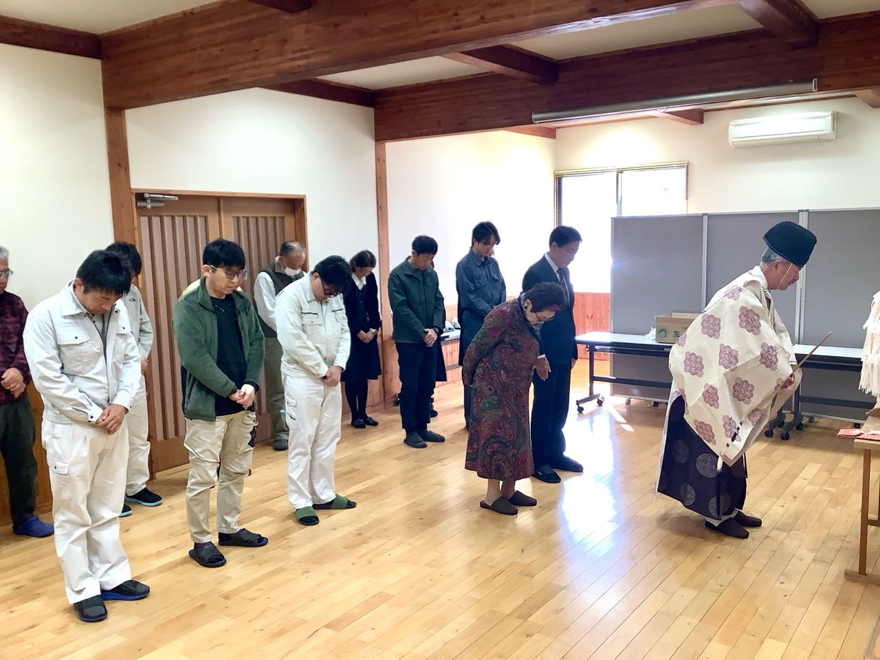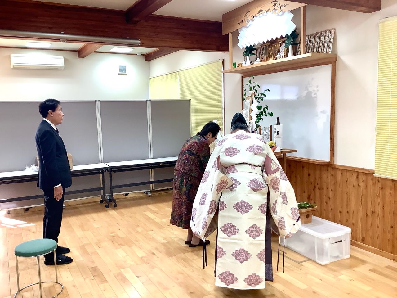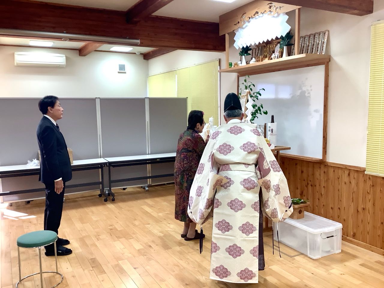 16日.山梨県森林総合コンサルタントでは、午前10時より、甲斐市下今井の、庁舎において、平成8年度の「山の日」→16日に.甲府市穴切神社の.秋山宮司さまを、お願いし、職員全員で「安全祈願祭」を、行いました、写真は.理事長である私が、最初に→玉串を神様に捧げて、次に金子専務が玉串を捧げ→次に、篠原総務部長と職員が全員一緒に、玉串に「安全祈願」を行いました、最後に無事で一年の祈願をした後、御みっき(酒)を、頂きました、ご覧になって下さい、