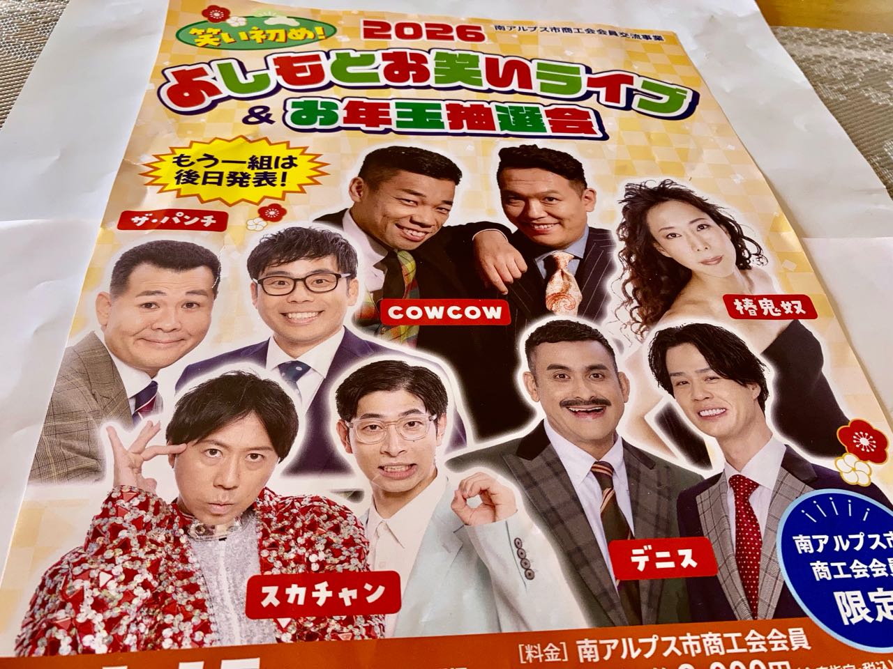 15日. 18時30分開演→南アルプス市.桃源文化会館に.於いて♪南アルプス市商工会.主催の→よしもと.お笑いライブの入場券を.Akikoさんに、入場券を、買って頂き、10人程で、見に行って来ました、お年玉抽選会も、行いました、