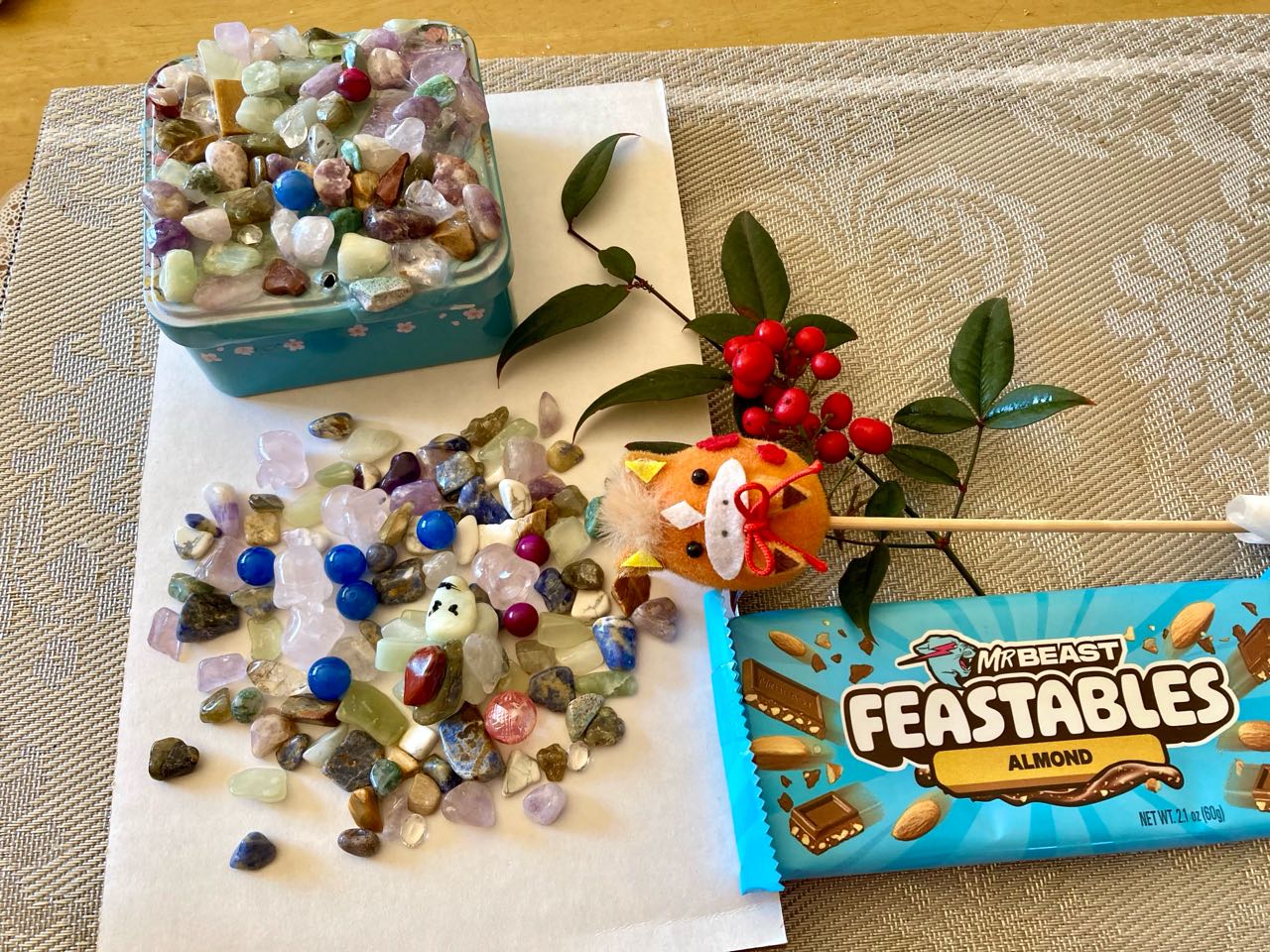 先日、勝沼の→「旅日記」に.ママと一緒に.出向き→1000円で→小さい.「宝石を拾って.来たそうです。.お家に、帰って来てから、一人で→☆宝石箱を作り、綺麗に.完成しました、チョコレートは→世界一の.ユーチューバーが作った。「ハワイのチョコレート」だそうです。、ご覧になって下さい。